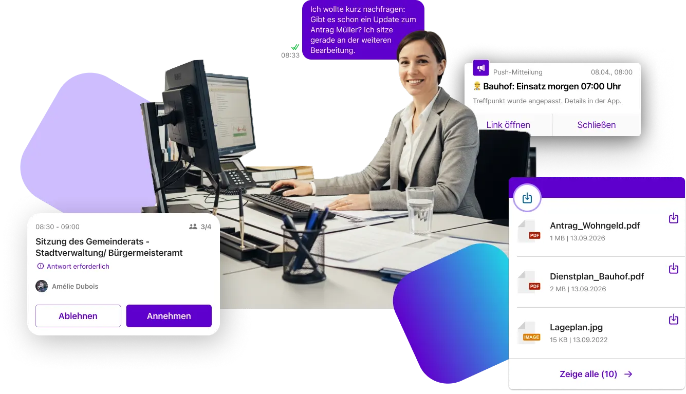 In vielen Kommunen verteilt sich interne Kommunikation auf E-Mail, Aushänge, Telefon, Intranet und private Messenger. Das führt dazu, dass Informationen nicht alle Mitarbeitenden erreichen – insbesondere außerhalb der klassischen Verwaltung.