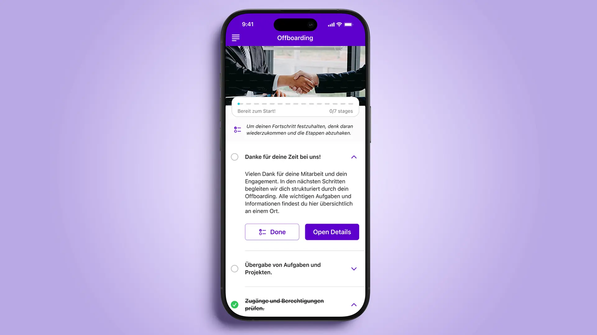All relevant steps, from returning equipment and access regulations to exit information, are provided in a structured manner. Mandatory stages ensure that critical tasks are not forgotten. At the same time, the system documents progress automatically and transparently.
