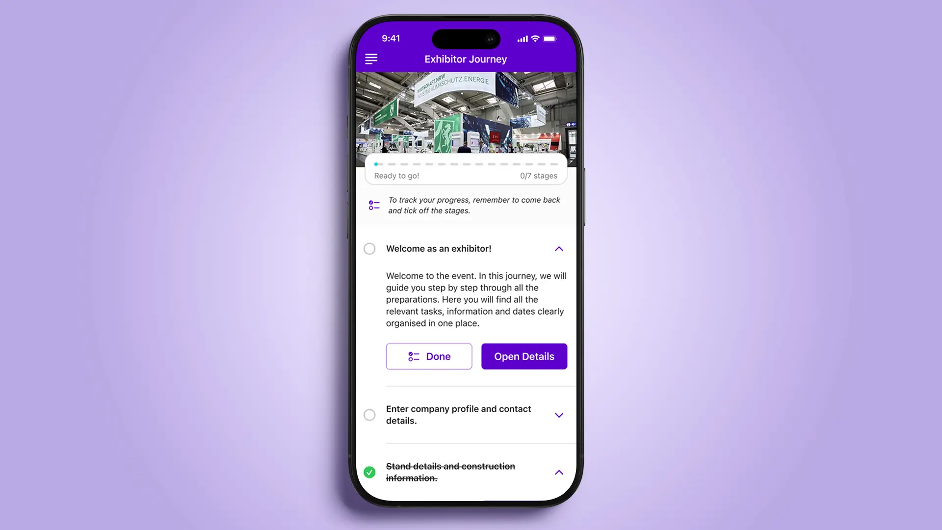 Exhibitors receive a clearly structured sequence of tasks, from stand construction and technical specifications to scheduling appointments. Automatic notifications ensure that no important steps are overlooked. Organisers can see at a glance which exhibitors are fully prepared and where action is still needed.