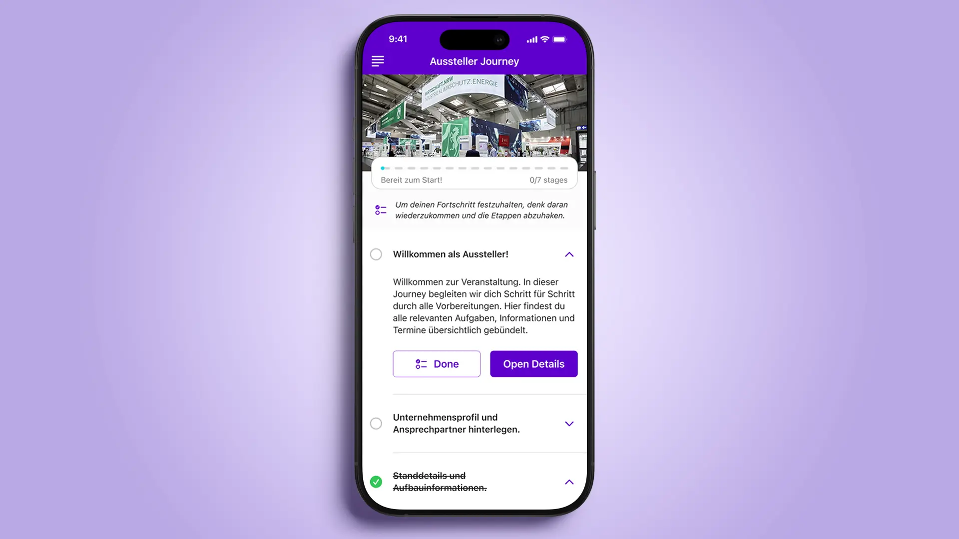 At trade fairs and conferences in particular, organisers work with many external exhibitors, often with very different requirements. Journeys create a uniform structure here without obscuring individual characteristics.