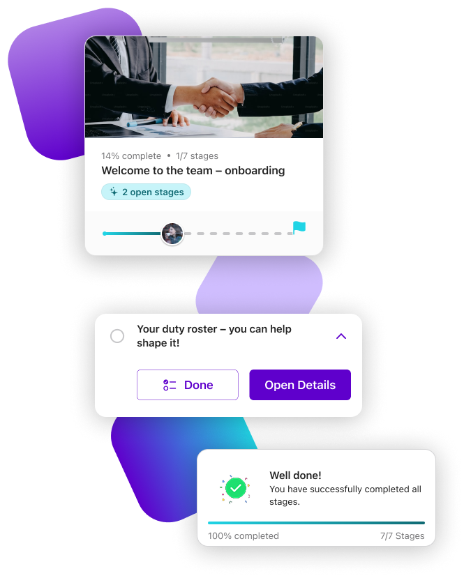 Journeys enable time-controlled content, checklists and automated processes for onboarding, events and training in a centralised app.